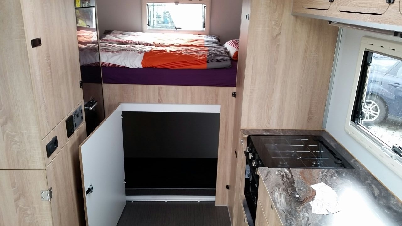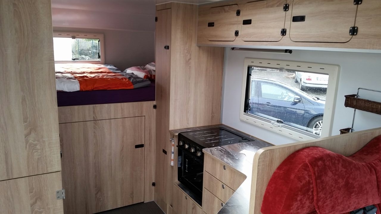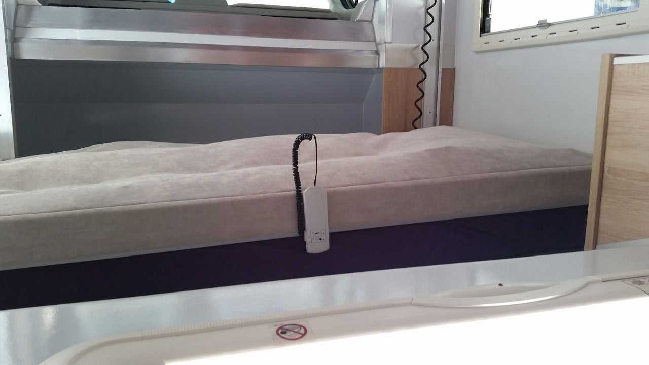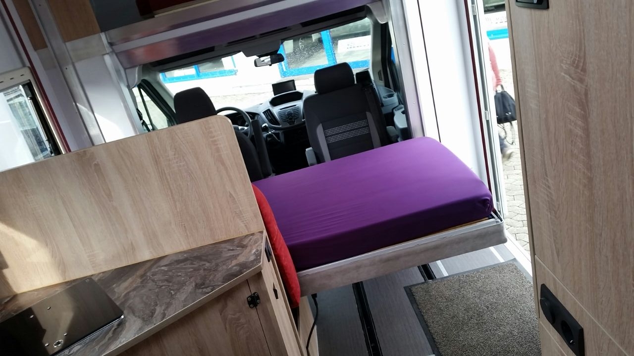 Die Innenausstattung ist so gewählt das man mit einem normalen Rollstuhl sich im Fahrzeug bewegen kann. Es ist ein Hubbett verbaut welches zu Schlafzwecken herunter gelassen werden kann und tagsüber unter der Decke hängt.