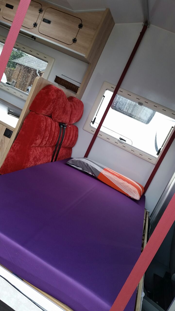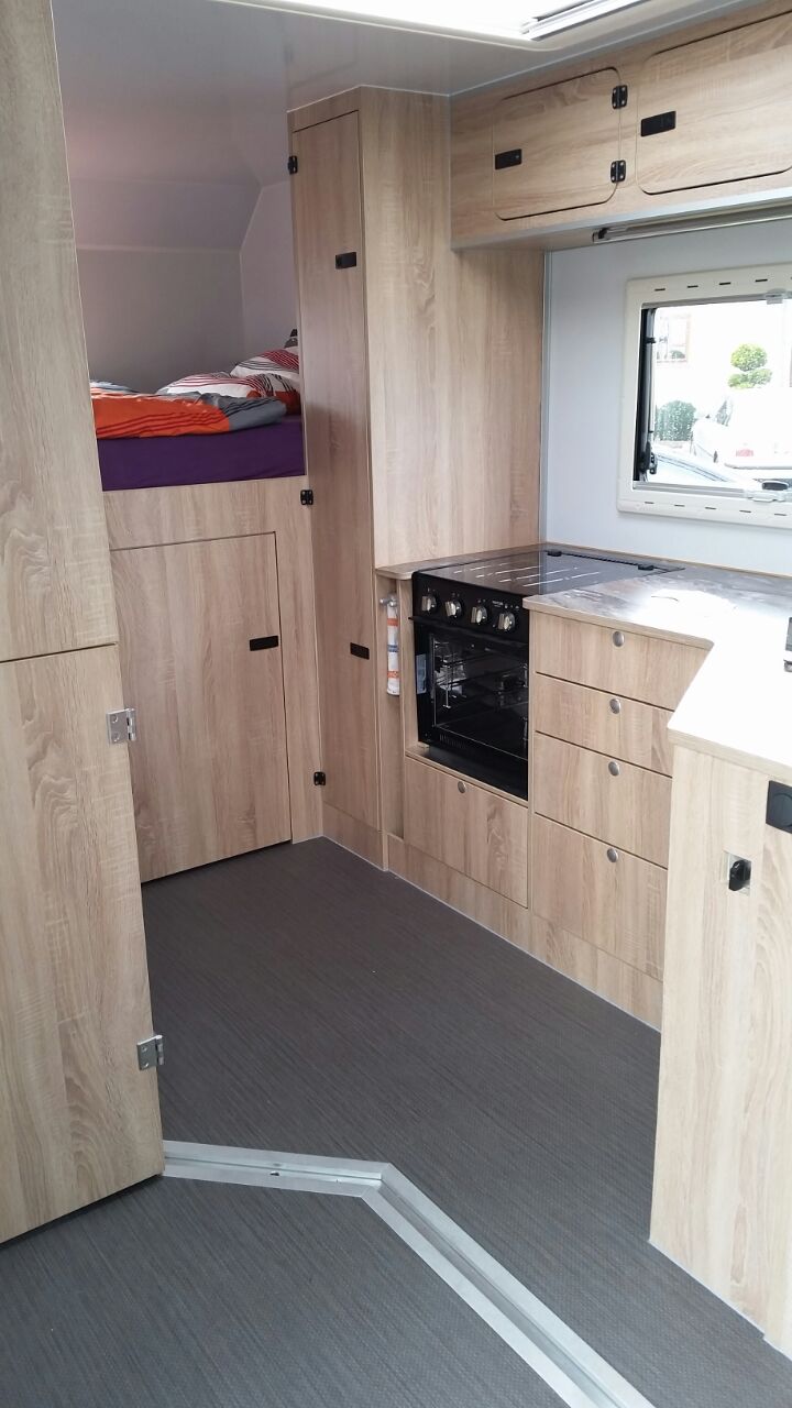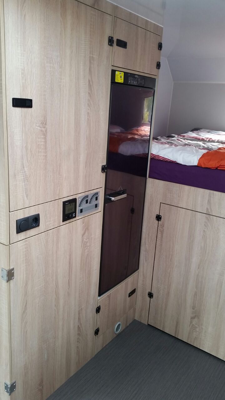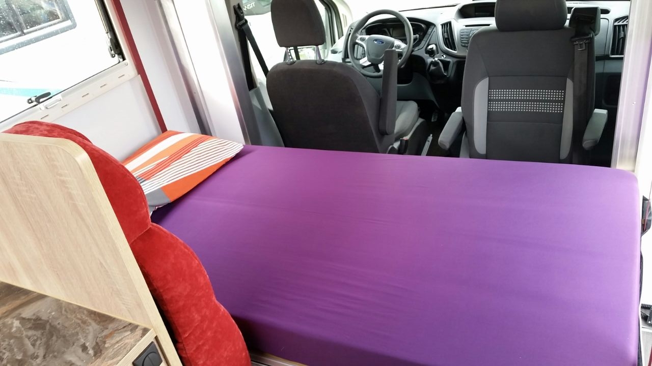 Die Innenausstattung ist so gewählt das man mit einem normalen Rollstuhl sich im Fahrzeug bewegen kann. Es ist ein Hubbett verbaut welches zu Schlafzwecken herunter gelassen werden kann und tagsüber unter der Decke hängt.