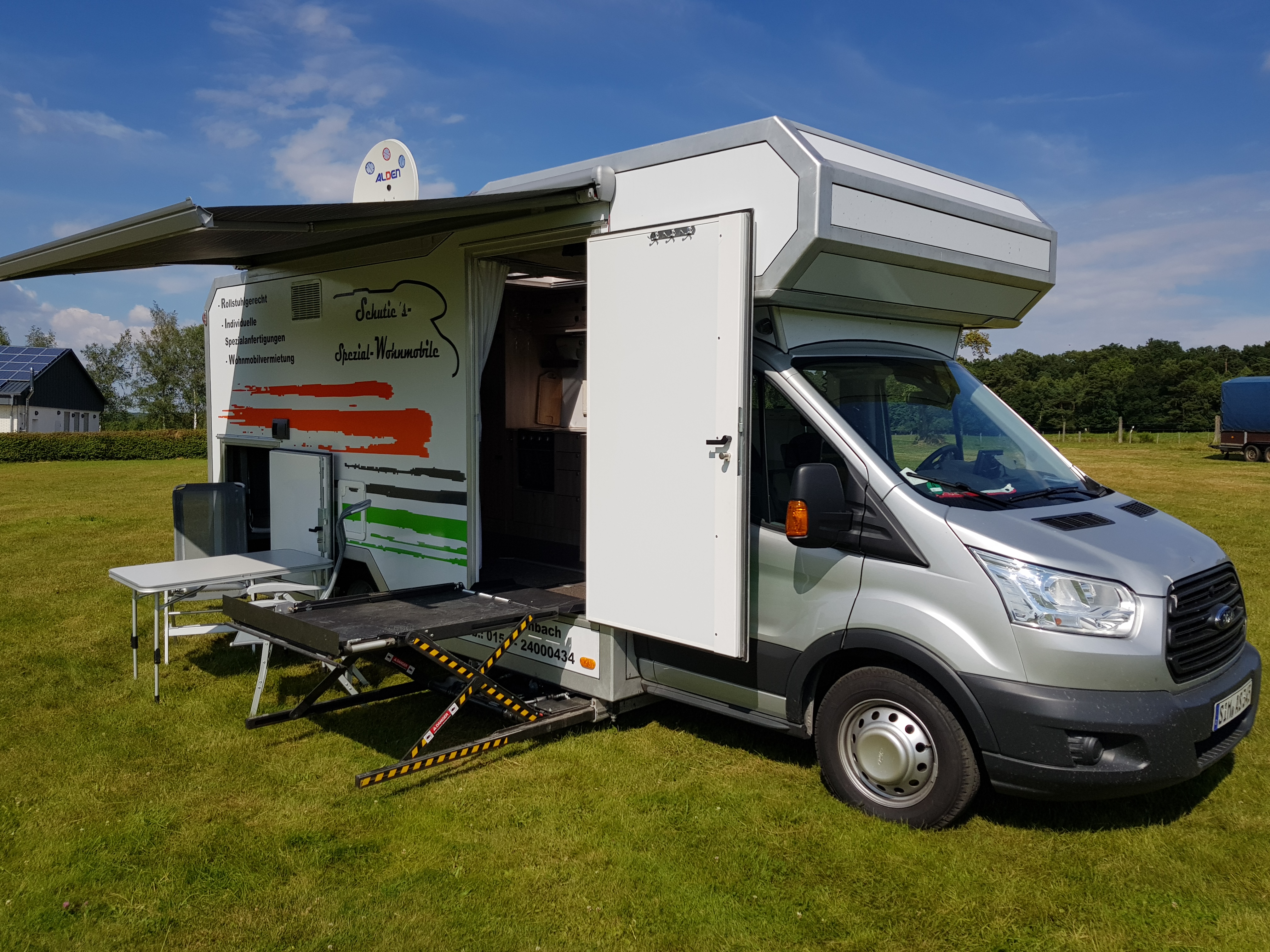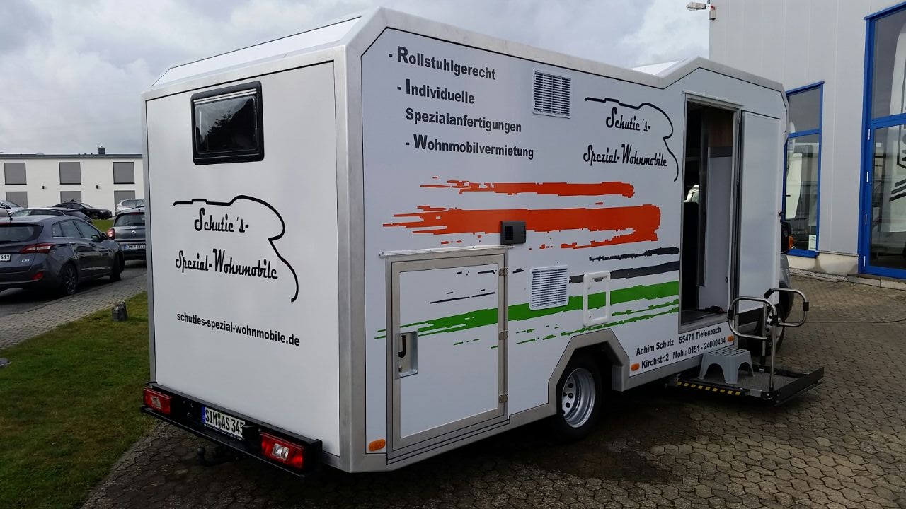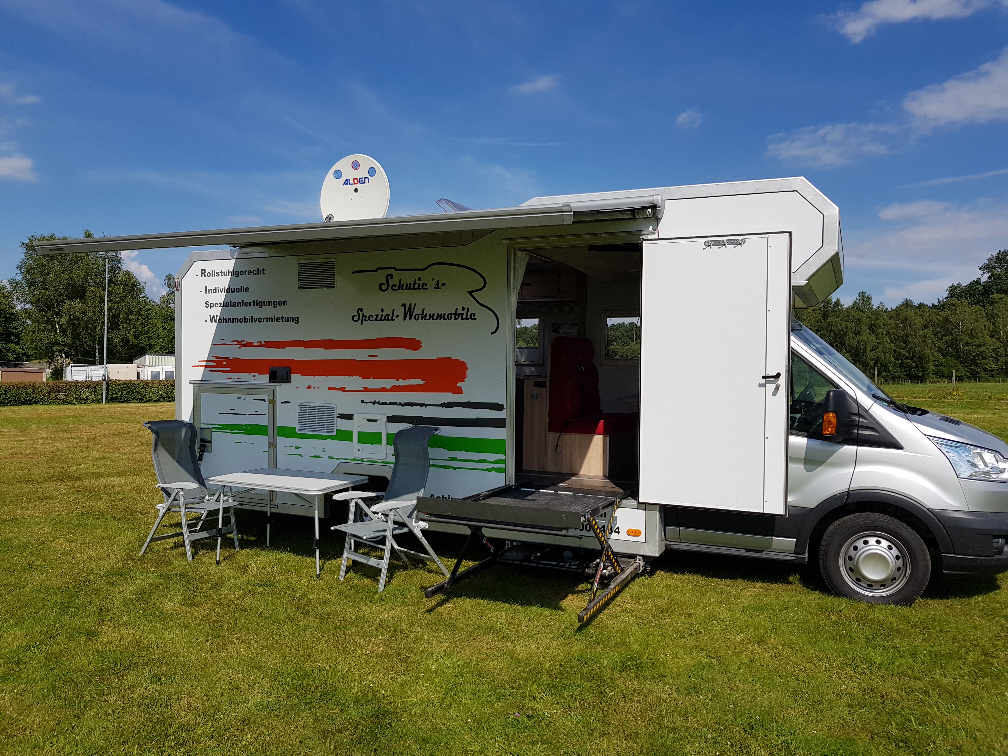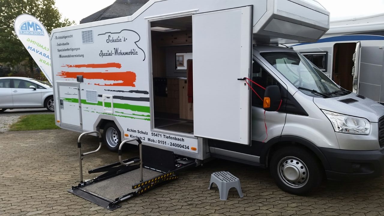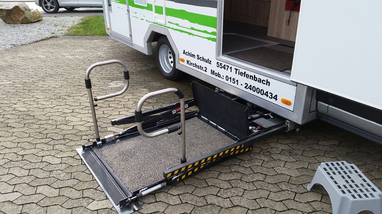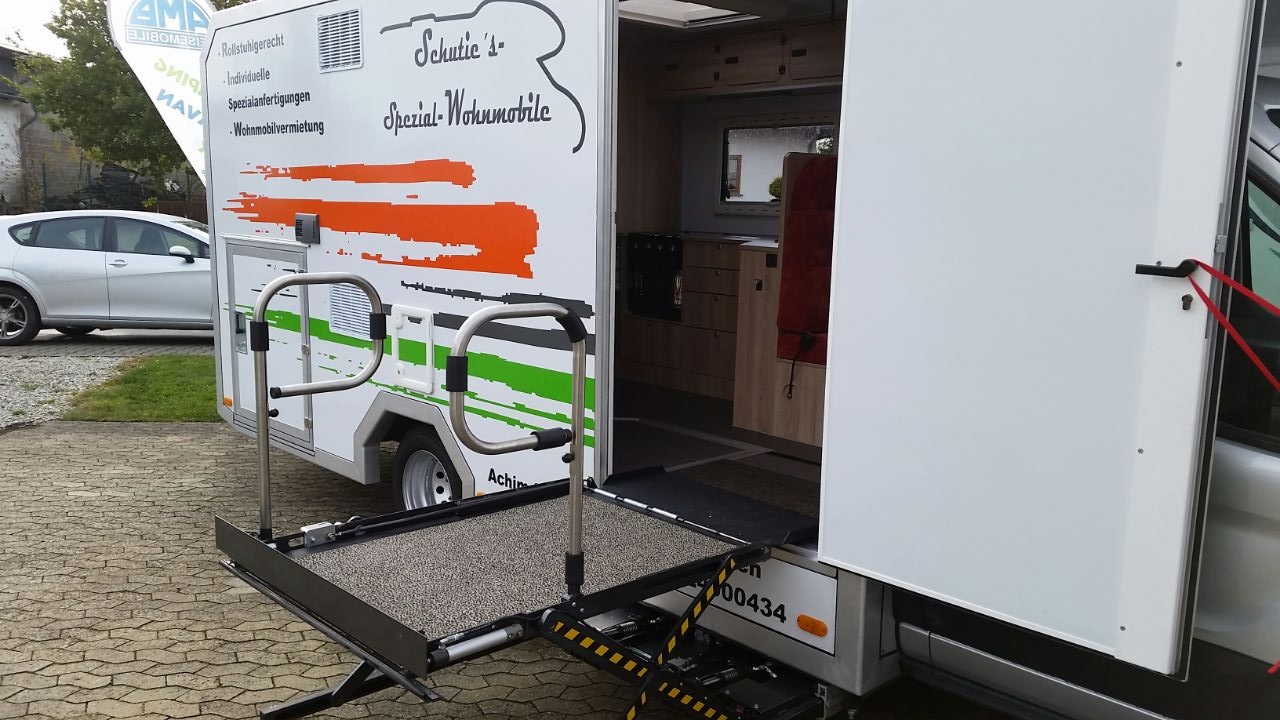 Es befindet sich ein großer Stauraum im Heck des Fahrzeug wo auch ein großer E -rollstuhl platz findet. Der Beifahrersitz kann gedreht und auf Schienen bewegt werden. Mit einer Hebebühne welche 350Kg hebt wird man zum Innenraum hoch gehoben. Ebenso ist ein WC und Waschbecken verbaut das versteckt ist. Ein großer Duschplatz gibt ebenfalls.