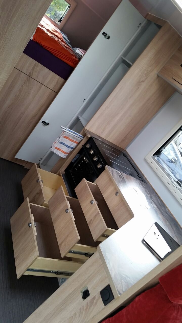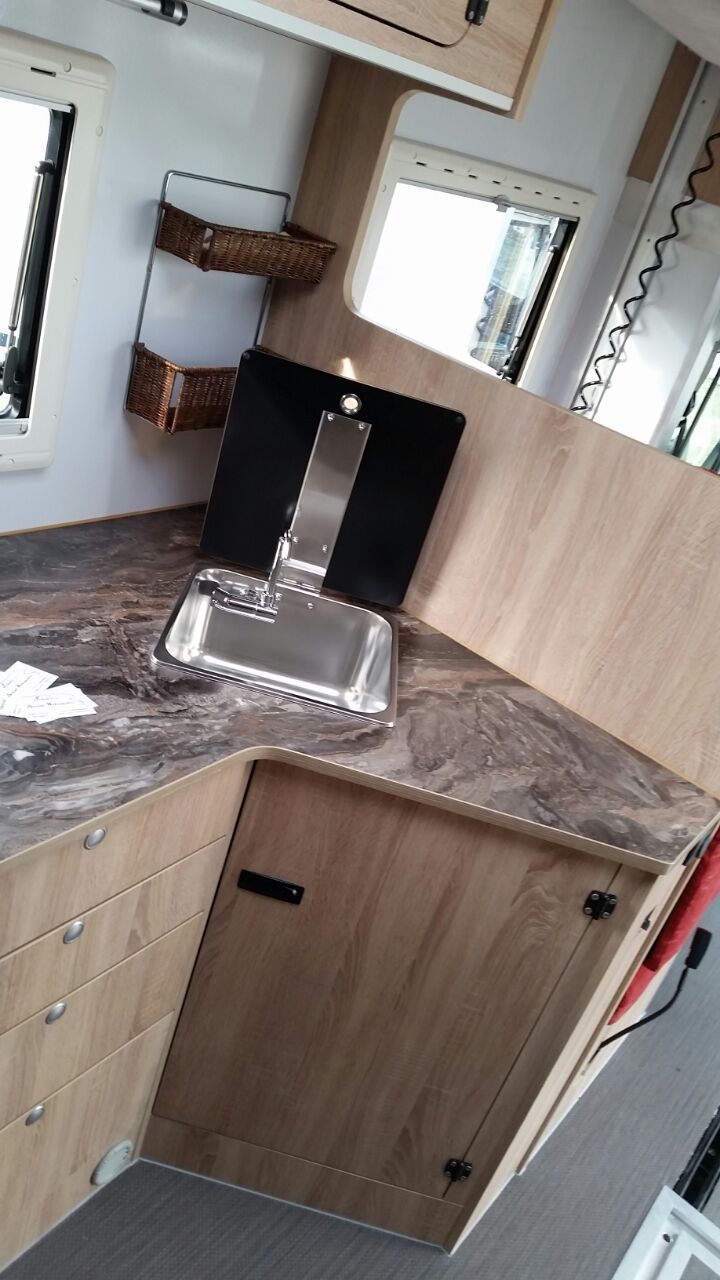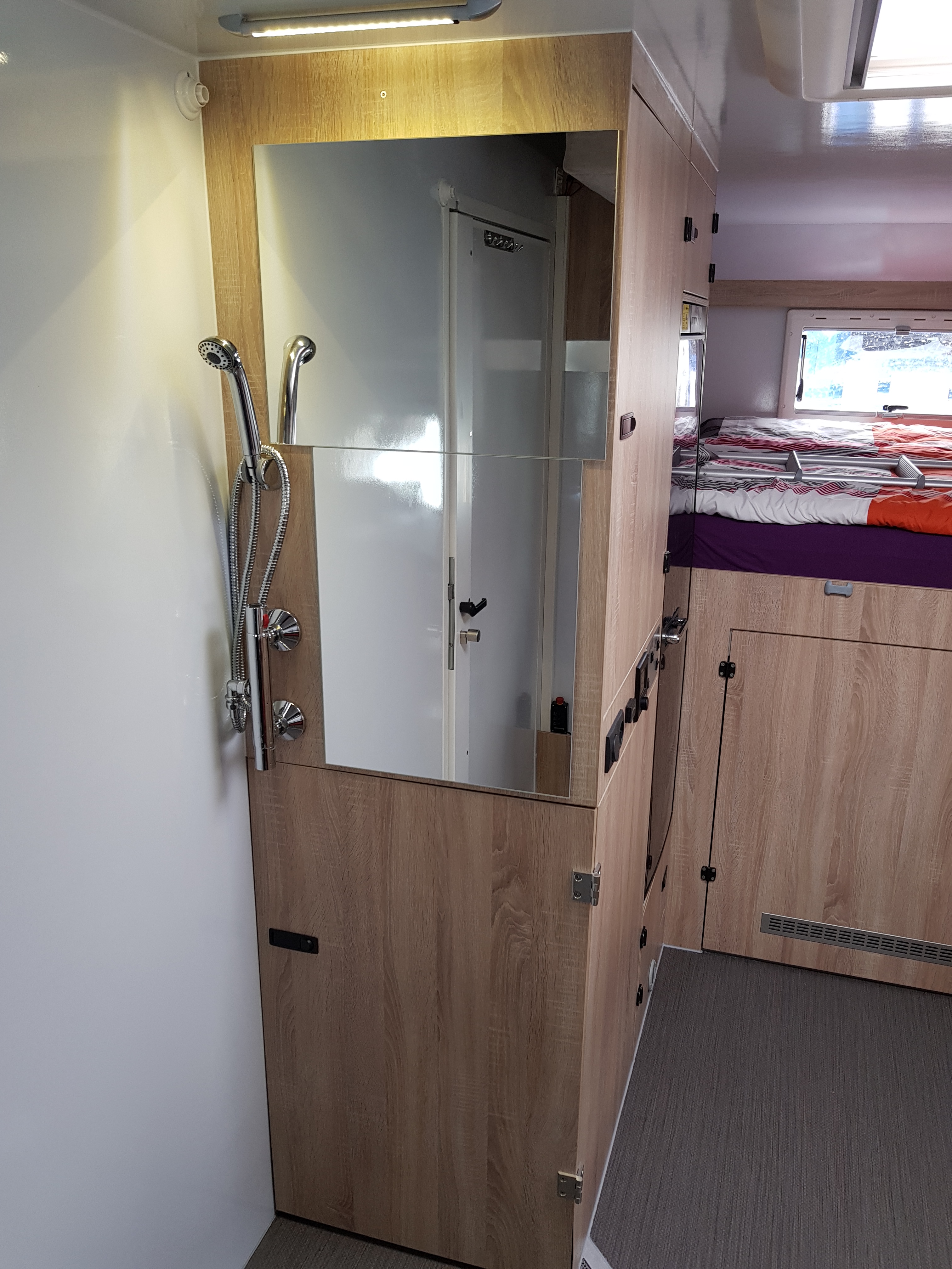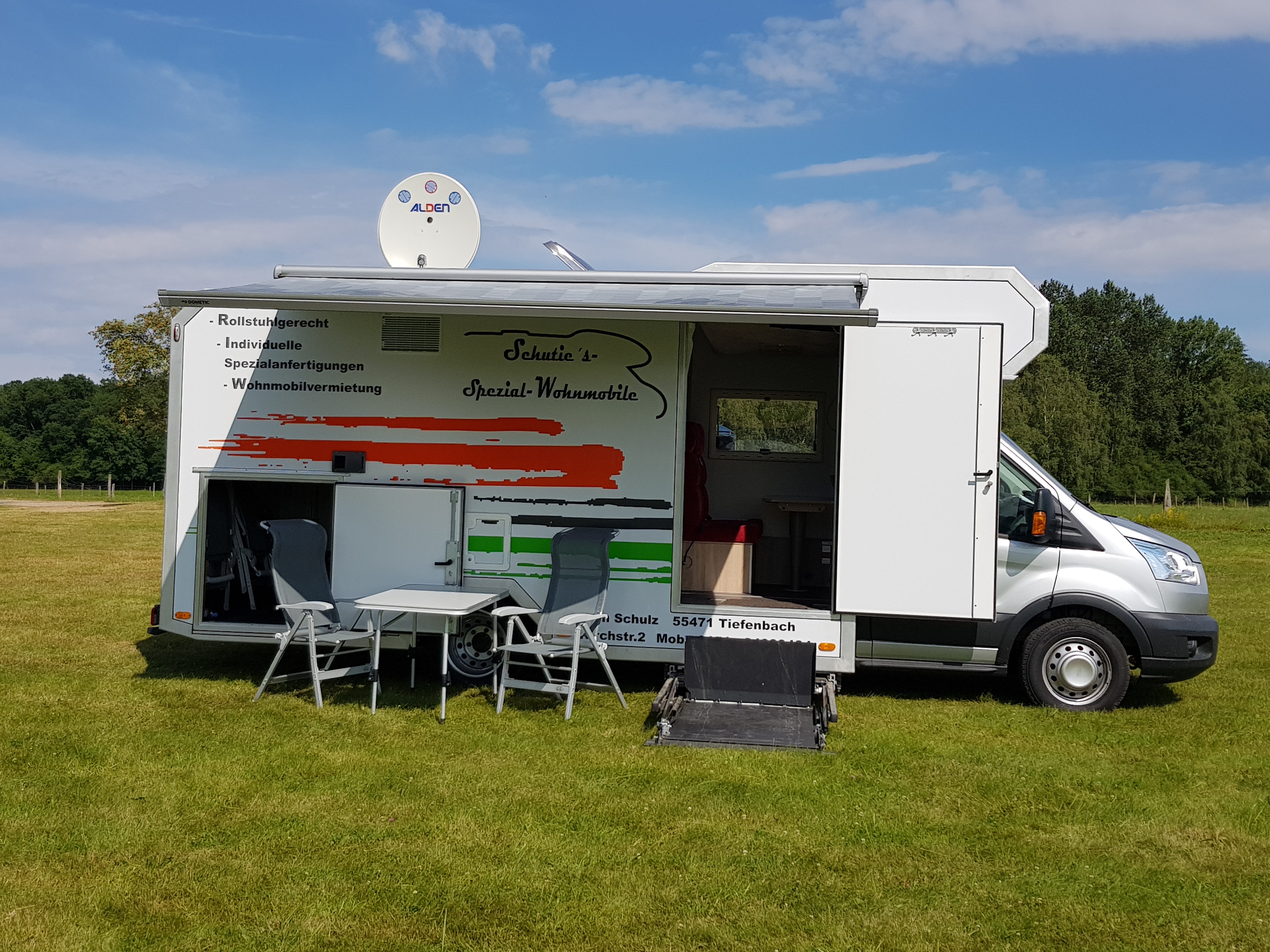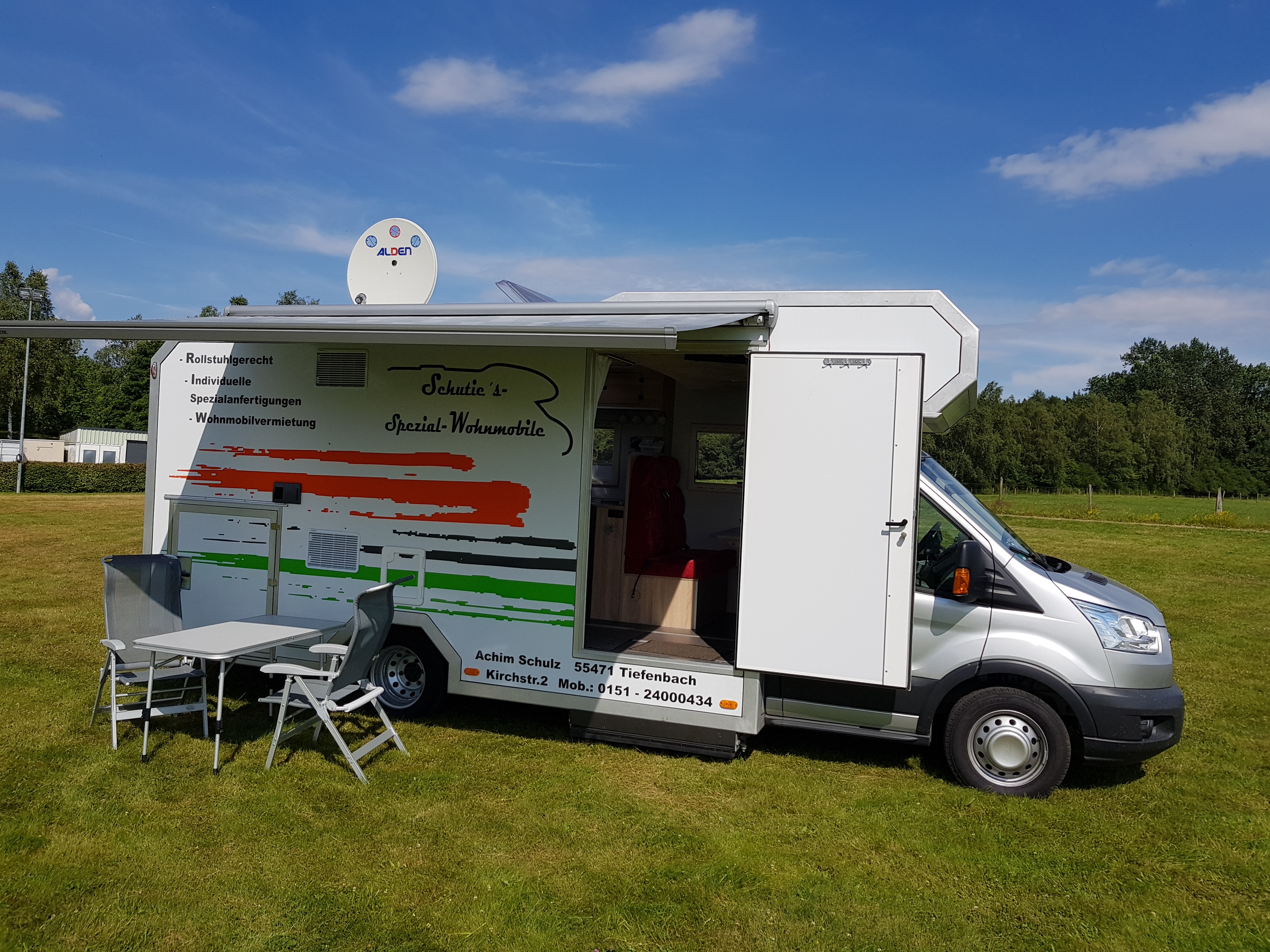 Es befindet sich ein großer Stauraum im Heck des Fahrzeug wo auch ein großer E -rollstuhl platz findet. Der Beifahrersitz kann gedreht und auf Schienen bewegt werden. Mit einer Hebebühne welche 350Kg hebt wird man zum Innenraum hoch gehoben. Ebenso ist ein WC und Waschbecken verbaut das versteckt ist. Ein großer Duschplatz gibt ebenfalls.